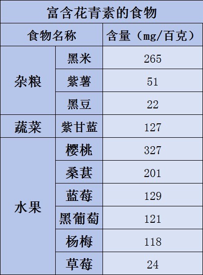 r花青素的颜色表现多样,尤以紫黑色食物中最丰富。具体哪些食物富含花青素?含量如何?可可给大家总结了一份表格↓